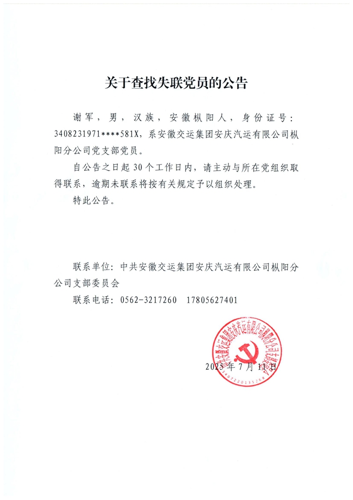 樅陽分公司黨支部關于查找失聯(lián)黨員的公告