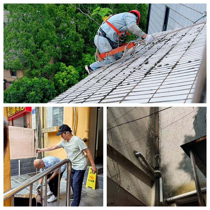 8月安全巡查期間,綜合服務(wù)中心安全科針對紡織南路7號樓及周邊區(qū)域開展專項(xiàng)隱患排查,發(fā)現(xiàn)兩處亟待處理的安全問題:一是7號樓公廁外側(cè)落水管多處破裂,導(dǎo)致雨水滲漏至路面并形成大面積積水,不僅影響市容環(huán)境,更對過往車輛及行人構(gòu)成潛在風(fēng)險(xiǎn);二是慶達(dá)綜合樓頂層臨街面瓷磚多處開裂,縫隙中滋生的灌木根系已侵入建筑結(jié)構(gòu),存在高空墜物隱患,嚴(yán)重威脅公共安全。
