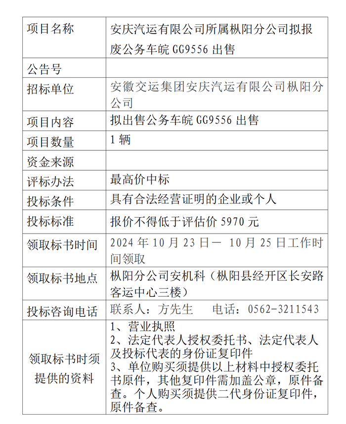 樅陽分公司擬報(bào)廢公務(wù)車皖GG9556出售公告