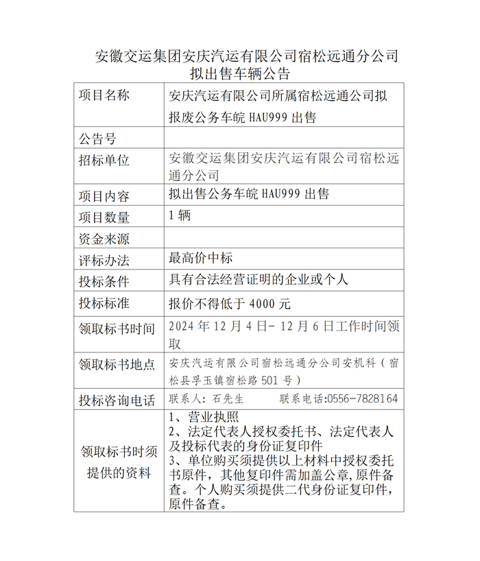 宿松遠(yuǎn)通分公司擬出售車(chē)輛公告